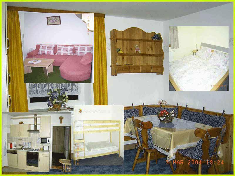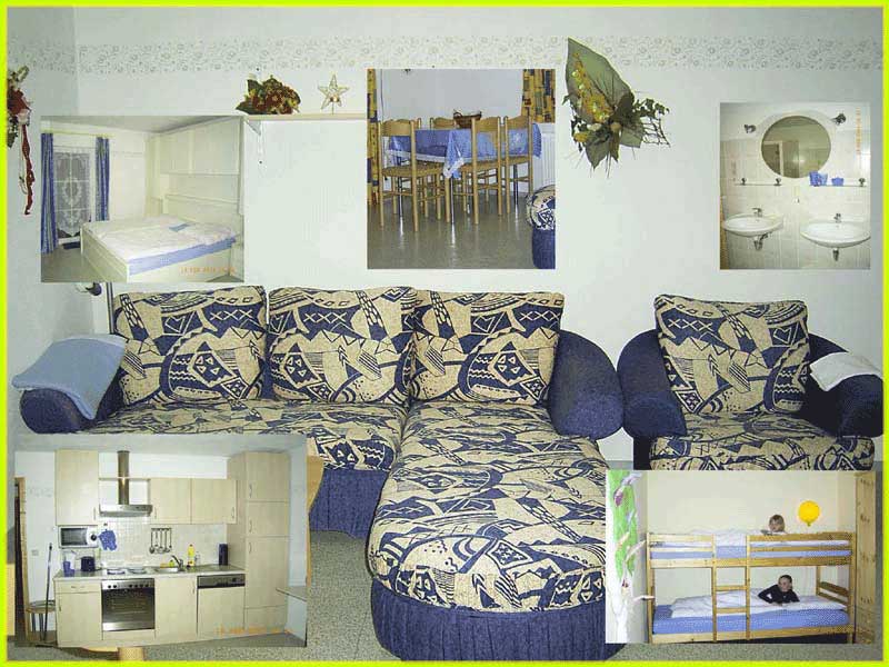 | Wohnungen Unsere gemütlichen, komplett eingerichteten Ferienwohnungen sind liebevoll und kindgerecht ausgestattet. Sie finden hier alles, was das Herz begehrt: Spülmaschine, Kühlgefrierkombination, Mikrowelle, SAT-TV, Wasserkocher, Kaffeemaschine, Fön, Hand- und Geschirrtücher, komplette Bettwäsche und auf Wunsch auch kostenlos Baby- und Kleinkindausstattung. Außerdem bieten wir Ihnen einen Aufenthaltsraum mit Waschmaschine und Kinderspielecke, sowie einen kostenlosen Brötchen- und Getränkeservice an. Ein kinderfreundlicher Urlaub in familiärer Atmosphäre ! Zur Erholung und Entspannung steht Ihnen außerdem zweimal wöchentlich kostenlos unser Wellnessbereich mit "Stadl"- Sauna zur Verfügung. Für Aktive ist täglich der Fitnessbereich zugänglich. Keine Haustiere ! Ferienwohnung